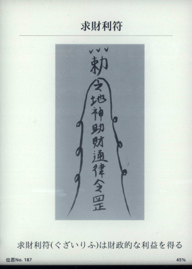 名前「求財符」「文字の色黒」効果「財政利益を得る、商売繁盛、事業繁盛」※この護符には毎月15日に強い酒50度以上を供える必要がある。