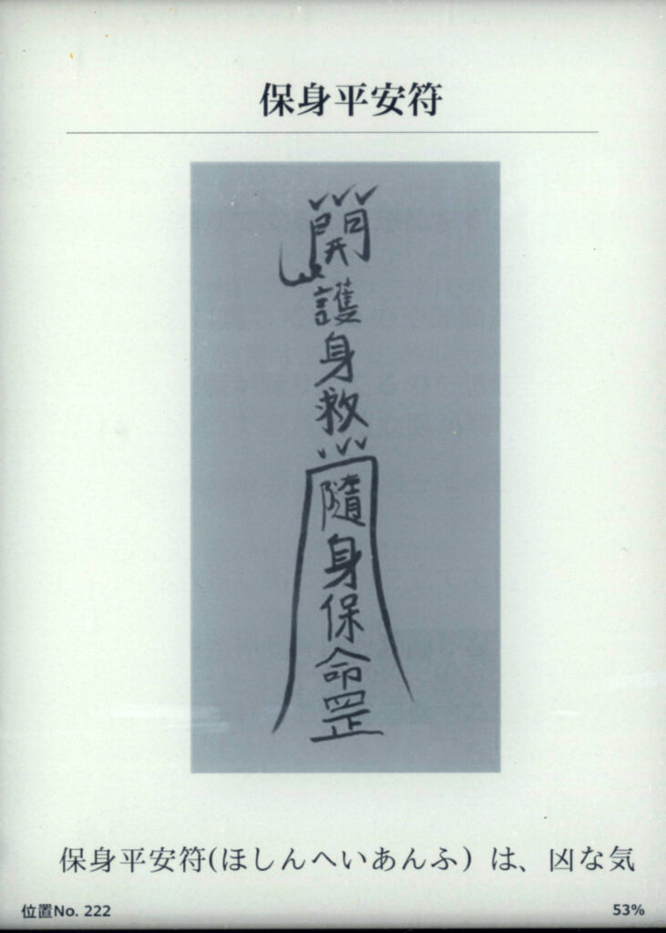 名前「保身符」「文字の色、黒」「意味、不吉な気、自身の健康祈願」※カバン等に入れて常に身に付ける、携帯する必要がある。※護符を入れているカバン等を跨がない、雑に扱わない。