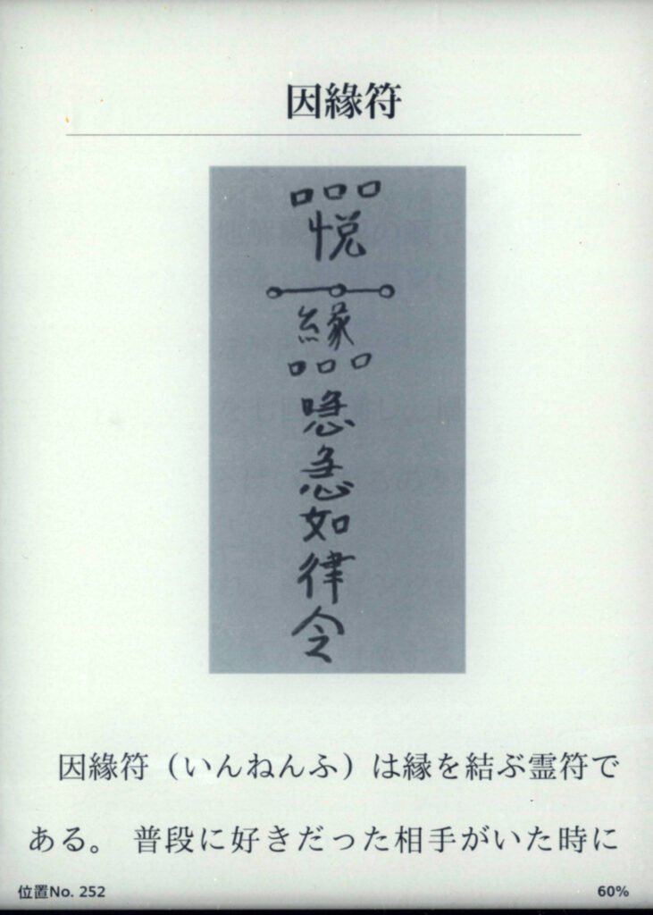 名前「縁結び符」「文字の色黒、紙の色赤」「効果、好きな相手が居る場合使用した方が良い。但し相手の状態、相手に好きな方が居る、付き合って居る、結婚している場合は、効果は低い。」